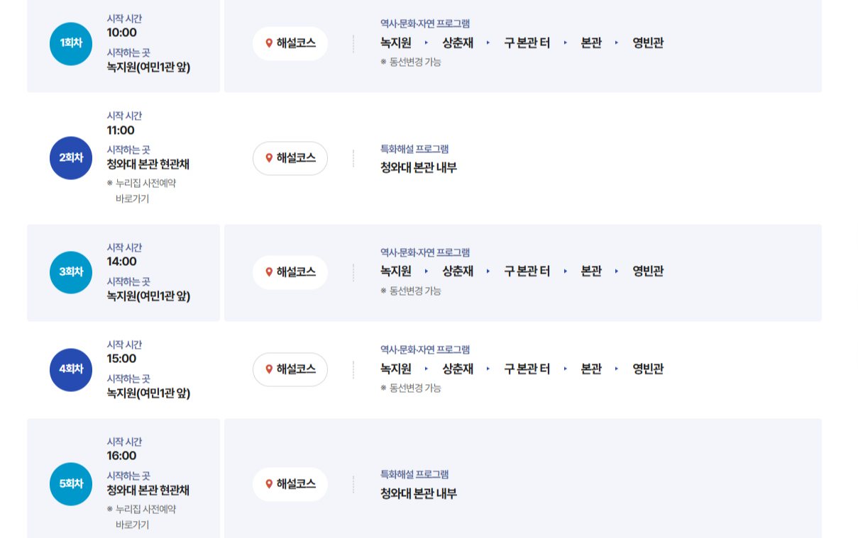 - 출발시간이 지나 이미 해설이 진행된 내용에 대해서는 재해설이 불가하오니, 출발시간을 엄수하여 주시기 바랍니다.